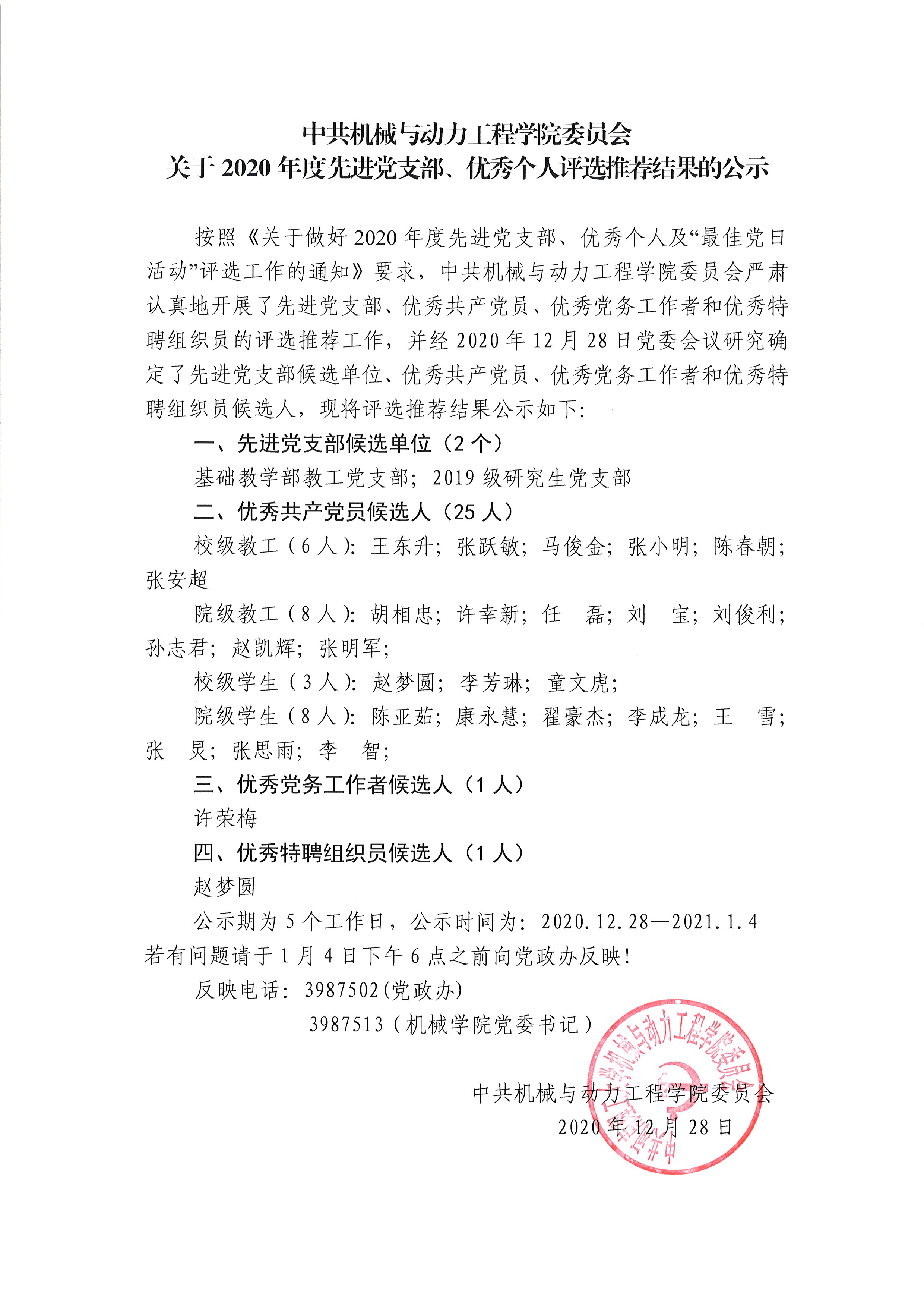 根据《关于印发〈河南理工大学基层党组织和党员创先争优活动年度评选实施办法〉的通知》和《关于做好2020年度先进党支部、优秀个人及“最佳党日活动”评选工作的通知》要求,经各支部推荐,院创先争优活动领导小组会议评选研究,党委会会议审定,现将永利官网2020年度先进党组织、优秀共产党员和优秀特聘组织员的评选结果(详细名单见附件)予以公示,如有异议(学生优秀共产党员要着重看是否存在违规违纪或考试不及格的现象),请于2021年1月4日前以电话或书面形式(署名)向学院党政办公室反映。