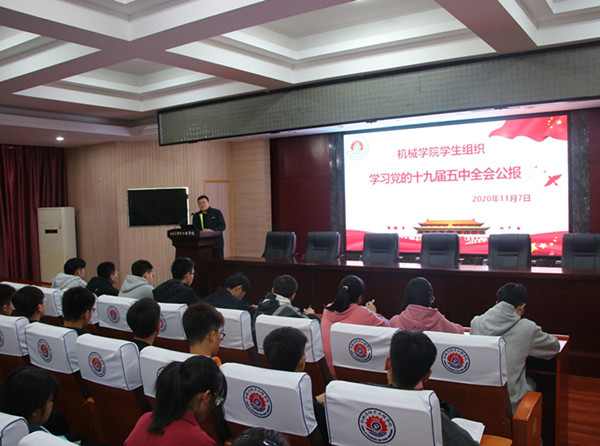 为了提高学生组织预备干部政治思想境界,引导他们了解国家政事,增进“四个自信”,紧跟党走,11月7日,永利官网团委在院楼205会议室组织学生组织预备干部开展了“学习十九届五中全会会议精神”活动。学习活动团委老师胡相忠主讲,永利官网学生会、青年志愿者协会、机械宣传中心的全体预备干部参加了学习活动。