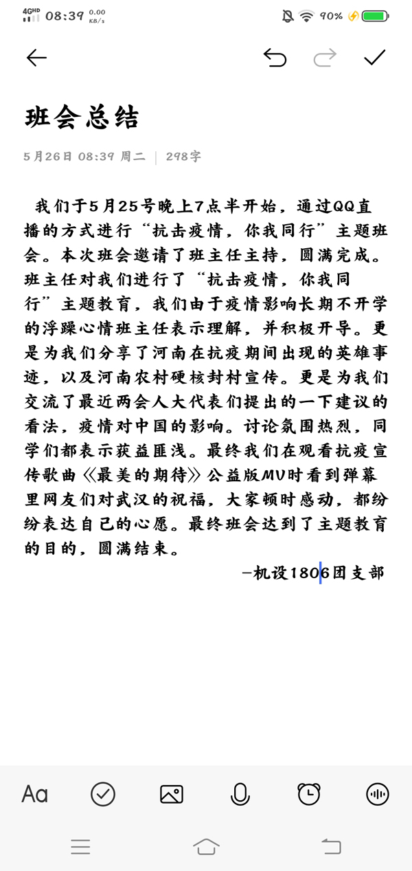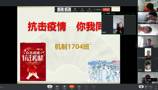 由于疫情形势严峻,本次主题班会全部采用线上会议,通过企业微信、钉钉、腾讯会议、QQ等平台,以PPT、文档形式,与学生视频,完成班会各项流程。此次班会还结合校文明办关于“美育云端课堂”活动的通知,将“美育云端课堂”融入主题班会,以网上演唱演出、名家音乐等艺术形式,如抗疫宣传歌曲《最美的期待》《长江,长江,我是黄河》《拥抱春天》等,设置班会开头曲和结尾曲,做到以美育人、以文化人。