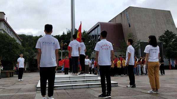 一次井冈行,一生井冈情。8月2日上午七时,庄严的国歌准时在基地奏响,由河南理工大学"明德任责"实践团以及其他兄弟院校组成的国旗护卫队,踏着雄壮威武的步伐,引着庄严嘹亮的口号,在基地中心广场进行了每日升国旗仪式。随着国旗在基地上空缓缓升起,"井冈情·中国梦"第二期暑期社会实践专项活动也悄然接近尾声。