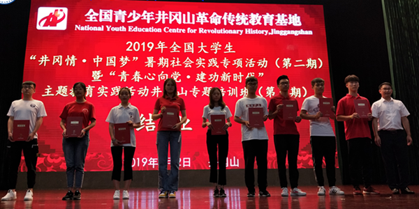 当晚,为深化学员对井冈精神的理解,增进各兄弟院校之间的友谊,基地特举办"井冈情·中国梦"第二期暑期社会实践专项活动结业仪式及文艺晚会。晚上七时许,结业仪式在庄严的团歌声中拉开帷幕。随后,第二期班主任龚杰登台做了结业致辞,他对各院校团队在井冈山学习期间对基地管理工作的配合表示感谢,对即将离开井冈山的学员表示依依不舍,并望学员不忘井冈之行所学所得,继续传承、弘扬井冈精神;之后,实践团尚楚涵同学作为学员代表登台作了结业发言,他表示,一次井冈行,一生井冈情,井冈山之行不仅是学习之旅、感动之旅更是责任之旅、信仰之旅,并且井冈之行不会结束,每一位学员都必将继续学习体悟和弘扬践行井冈山精神,让它在新时代绽放新的光芒;最后,举行了颁发结业证仪式,结业仪式顺利完成。
