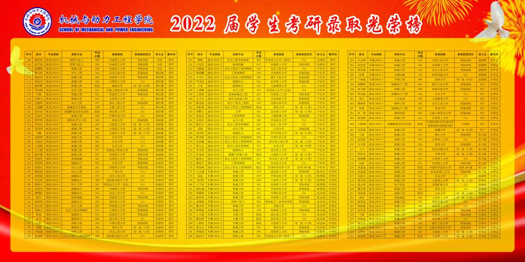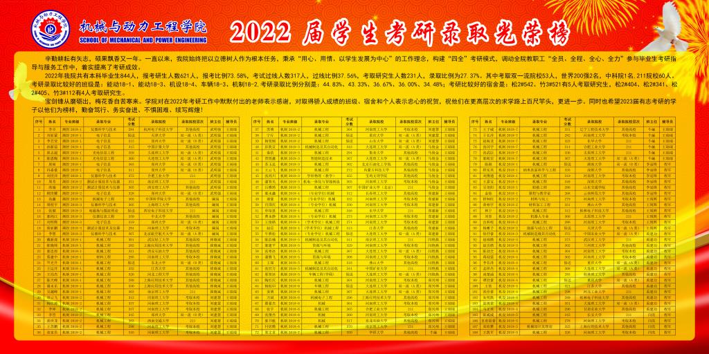 2022年永利官网共有本科毕业生844人,报考研生人数621人,报考比例73.58%,考试过线人数317人,过线比例37.56%,考取研究生人数231人,录取比例为27.37%。其中考取双一流院校53人,世界200强2名,中科院1名,211院校60人。考研录取比较好的班级是:能动18-1、能动18-3、机设18-4、车辆18-3、机制18-2,考研录取比例分别是:44.83%、43.33%、36.67%、36.00%、34.48%;考研比较好的宿舍是:松2#542、竹3#521有5人考取研究生,松2#404、松2#341、松2#405、竹3#112有4人考取研究生。