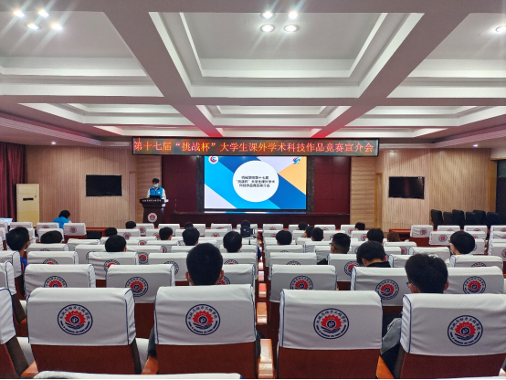 会上,组织部副部长康豪杰对借助PPT对赛事举办的通知要求进行了讲解,并对竞赛相关流程进行了介绍;同时,他还通过展示了往届参赛团队获奖作品,强调了参赛要求和作品申报要点,并阐释了“挑战杯”竞赛的“崇尚科学、追求真知、勤奋学习、锐意进取、迎接挑战”的主题。